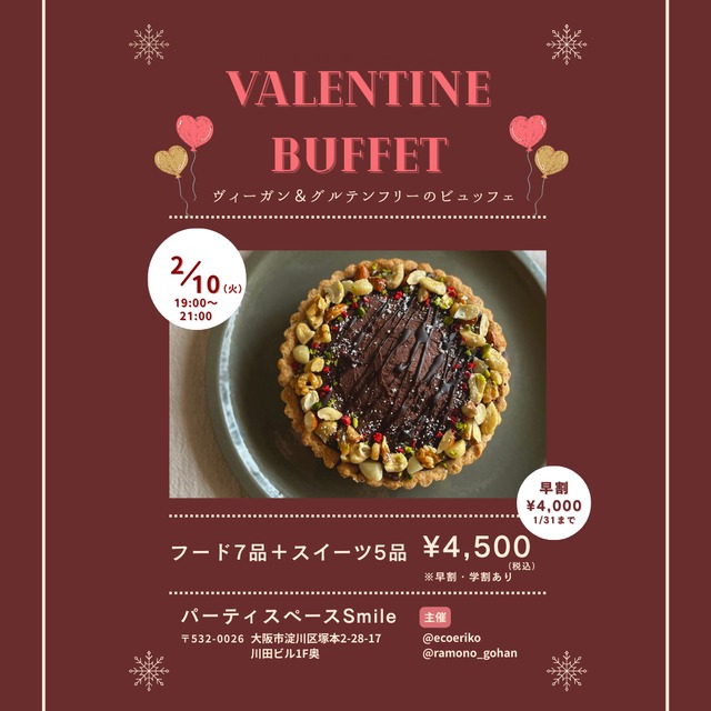 こちらのご購入をもってお申し込み完了となります。 後ほど受付完了メールを送信いたしますので、詳細をご確認の上当日会場までお越しくださいませ! ◇日時 2026年2月10日(火) 19:00-21:00 *18:30〜受付開始 ◇場所 パーティースペースSmile 大阪市淀川区塚本2-28-17 川田ビル1階奧 JR塚本駅 徒歩2分 ◇費用 ¥4,500(中学生以上の方は学割ページからお申し込みください) ◇定員 20名 ◇内容 全てプラントベース・グルテンフリーのフード&スイーツをビュッフェ形式でおたのしみいただけます。 *フードメニュー ・チーズフォンデュ ・ヴィーガンミートローフ ・マルゲリータ風ピザ ・ポタージュ ・おからこんにゃくの焼き鳥風 ・フライドポテト ・サラダ *スイーツ ・ゆずチョコタルト ・チョコケーキ ・トリュフ ・マフィン ・クッキー ※メニューは予告なく変更となる場合がございます ◇キャンセルポリシー やむを得ずキャンセルされる場合は、お問い合わせフォームまたはInstagramメッセージ(らものまふぃん @ramono_gohan)までご連絡をお願いいたします。 なお、当日キャンセルはキャンセル料100%頂戴いたしますので、ご理解の程よろしくお願いいたします。