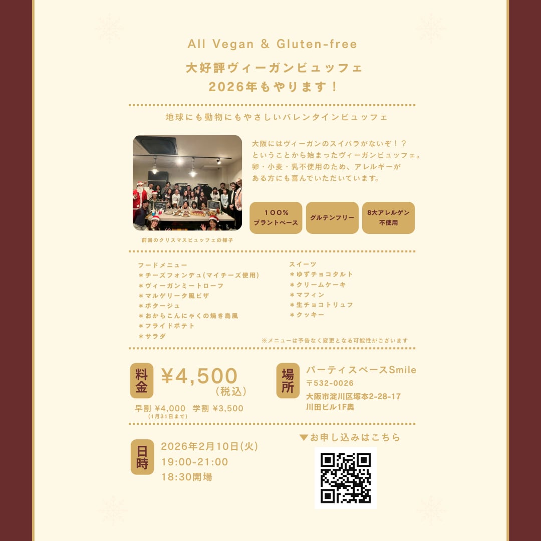 全てプラントベース・グルテンフリーのフード&スイーツをビュッフェ形式でおたのしみいただけます。